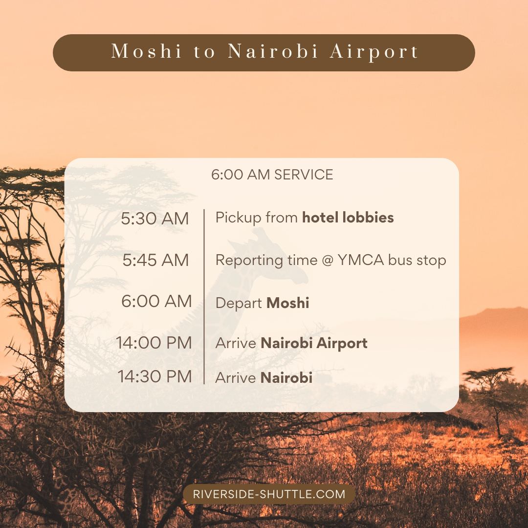 Daily departure fromย hotels in Moshi to Nairobi airport.